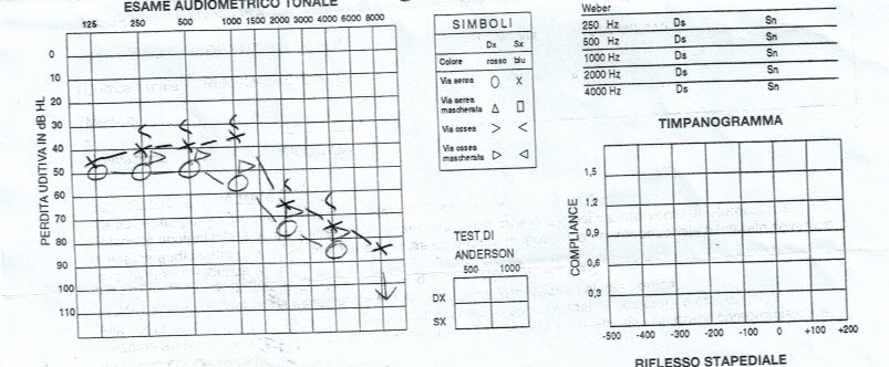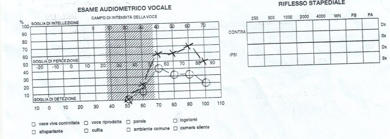 Come potete vedere dall’immagine e come abbiamo già esposto qui il test dell’udito si legge considerando l’asse x delle frequenze sonore, l’asse y come intensità: orecchio destro il cerchio, orecchio sinistro la x. Fin qui tutto bene e non si capisce perché la signora dovrebbe avere le difficoltà riscontrate.